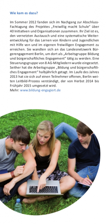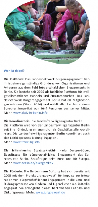 Im Sommer 2012 traten über vierzig Organisationen an das Landesnetzwerk Bür­ger­en­ga­ge­ment Berlin mit dem Wunsch heran, in Berlin die Verbindungen und Synergien der Bereiche „Engage­ment“ und „Bildung“ für Kinder und Jugendliche zu intensivieren und zu einem eigenen, aner­kannten Themen- und Handlungsfeld in Politik und Ge­sell­schaft zu entwickeln. In einem Diskus­sionsprozess unter Beteiligung von über 150 Fach­leuten und in drei Diskursforen von Herbst 2014 bis Früh­jahr 2015 wurde aus­ge­hend von dem Konzept Civic Education für die Berliner Si­tuation Folgendes er­ar­bei­tet.