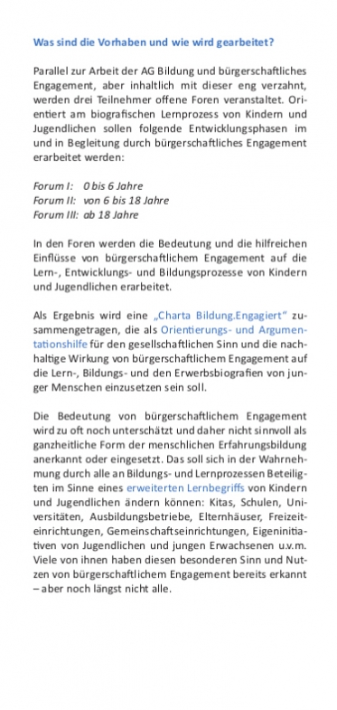 Parallel zur Arbeit der AG Bildung und bürgerschaftliches Engagement des Landesnetzwerks, aber inhaltlich mit dieser eng verzahnt, wurden drei offene Foren veranstaltet. Orientiert am bio­gra­fi­schen Lernprozess von Kindern und Jugendlichen sollten dabei folgende Ent­wick­lungs­phasen im und durch bürgerschaftliches Engagement er­ar­bei­tet werden.