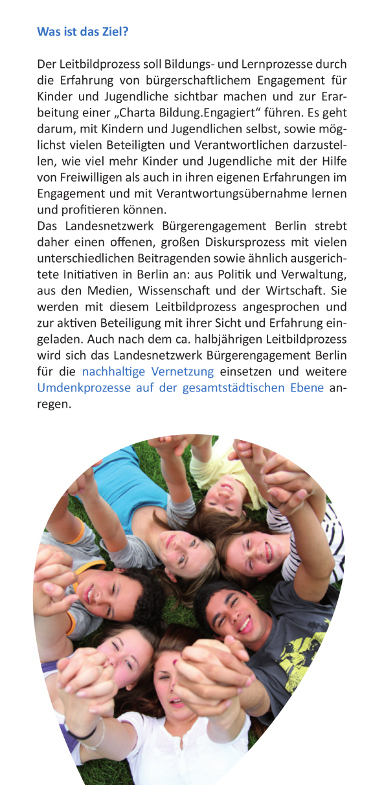 Für diese Lebensabschnitte sollen von den beteiligten Leitbild-Ent­wick­ler_in­nen die Bedeutung und hilfreichen Einflüsse von bür­ger­schaft­li­chem Engagement auf die Lern-, Entwicklungs- und Bildungsprozesse von Kindern und Jugendlichen strukturell und inhaltlich auf dem neu­es­ten Stand der Erkenntnisse aus Wissenschaft und Praxis erarbeitet wer­den.