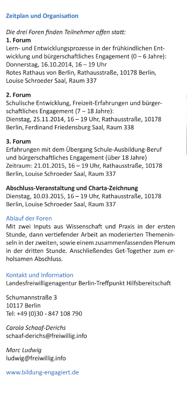 Parallel zur Arbeit der AG Bildung und bürgerschaftliches Engagement des Landesnetzwerks, aber inhaltlich mit dieser eng verzahnt, werden drei offene Foren veranstaltet. Orientiert am bio­gra­fi­schen Lernprozess von Kindern und Jugendlichen sollen folgende Ent­wick­lungs­phasen im und durch bürgerschaftliches Engagement er­ar­bei­tet werden: